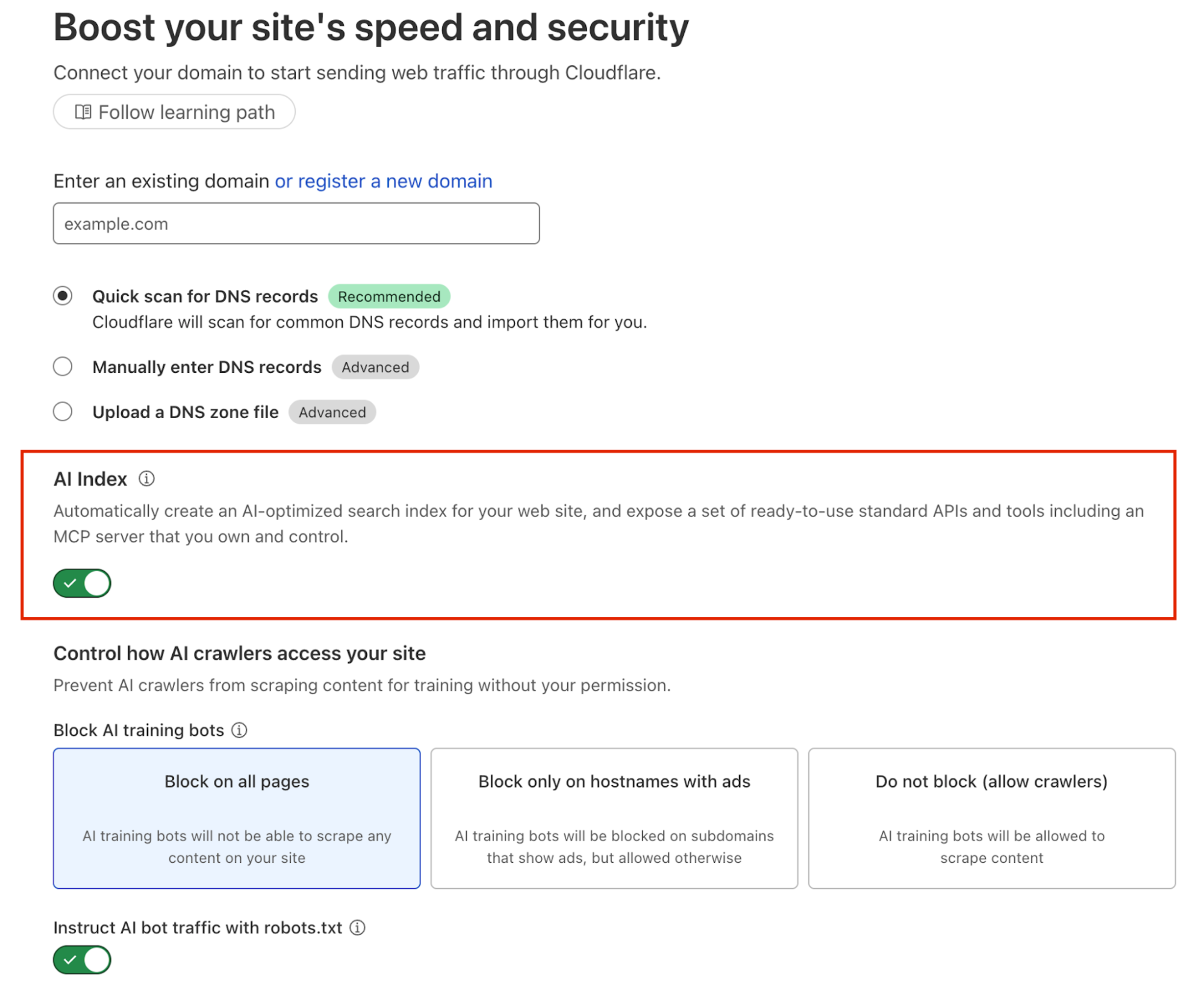 When you onboard a domain to Cloudflare, or if you have an existing domain on Cloudflare, you will have the choice to enable an AI Index. If enabled, we will automatically create an AI-optimized search index for your domain that you own and control.