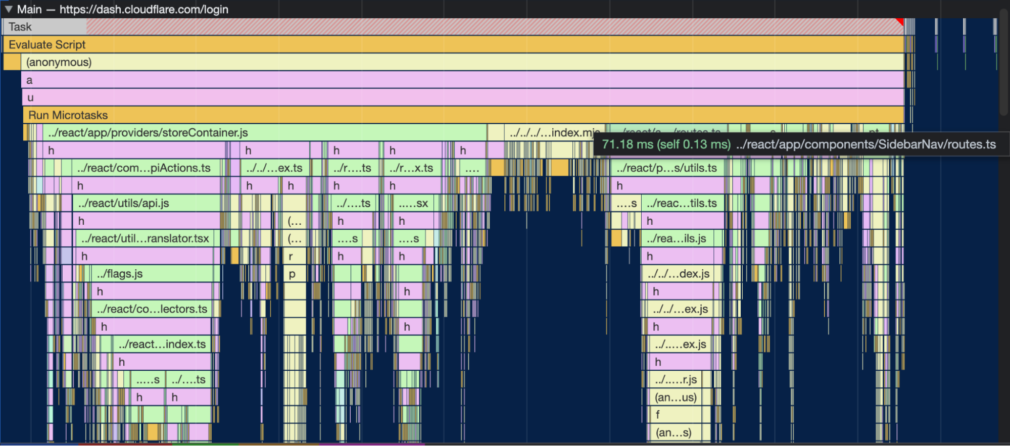 The Cloudflare dashboard is a single page application that houses all of the UI for our wide portfolio of existing products, as well as the new features we're releasing every day. However, a less-than-performant experience is not acceptable to us; we owe it to our customers to deliver the best performance possible.