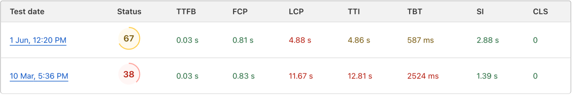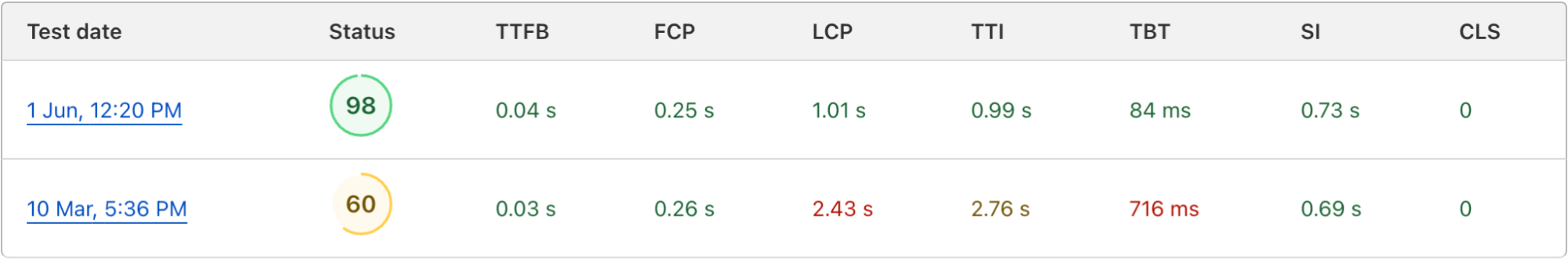 Using a combination of open-source tools offered by Google (Lighthouse and PageSpeed Insights) and our own homegrown solution (Cloudflare Speed Test), we benchmarked our Lighthouse performance scores starting in Q1 2023. We found the results were… somewhat disappointing: