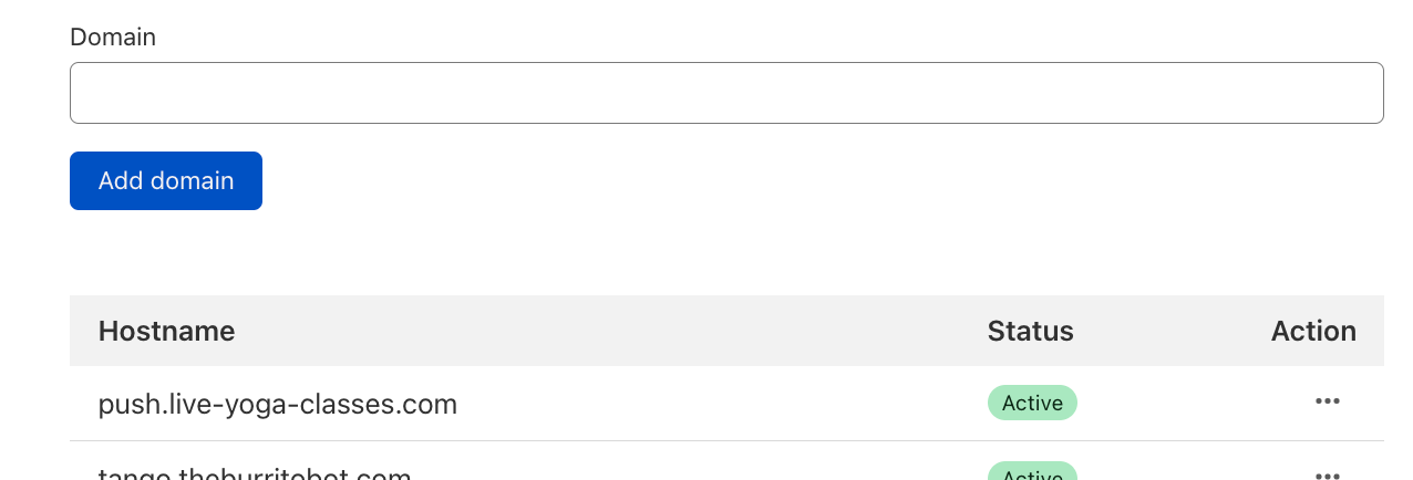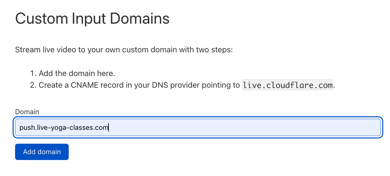 Until today, even if your live streaming platform was called live-yoga-classes.com, your users would need to push the RTMPS feed to live.cloudflare.com. Starting today, every Stream account can configure its own domain in the Stream dashboard. And your creators can broadcast to a domain such as push.live-yoga-classes.com.
