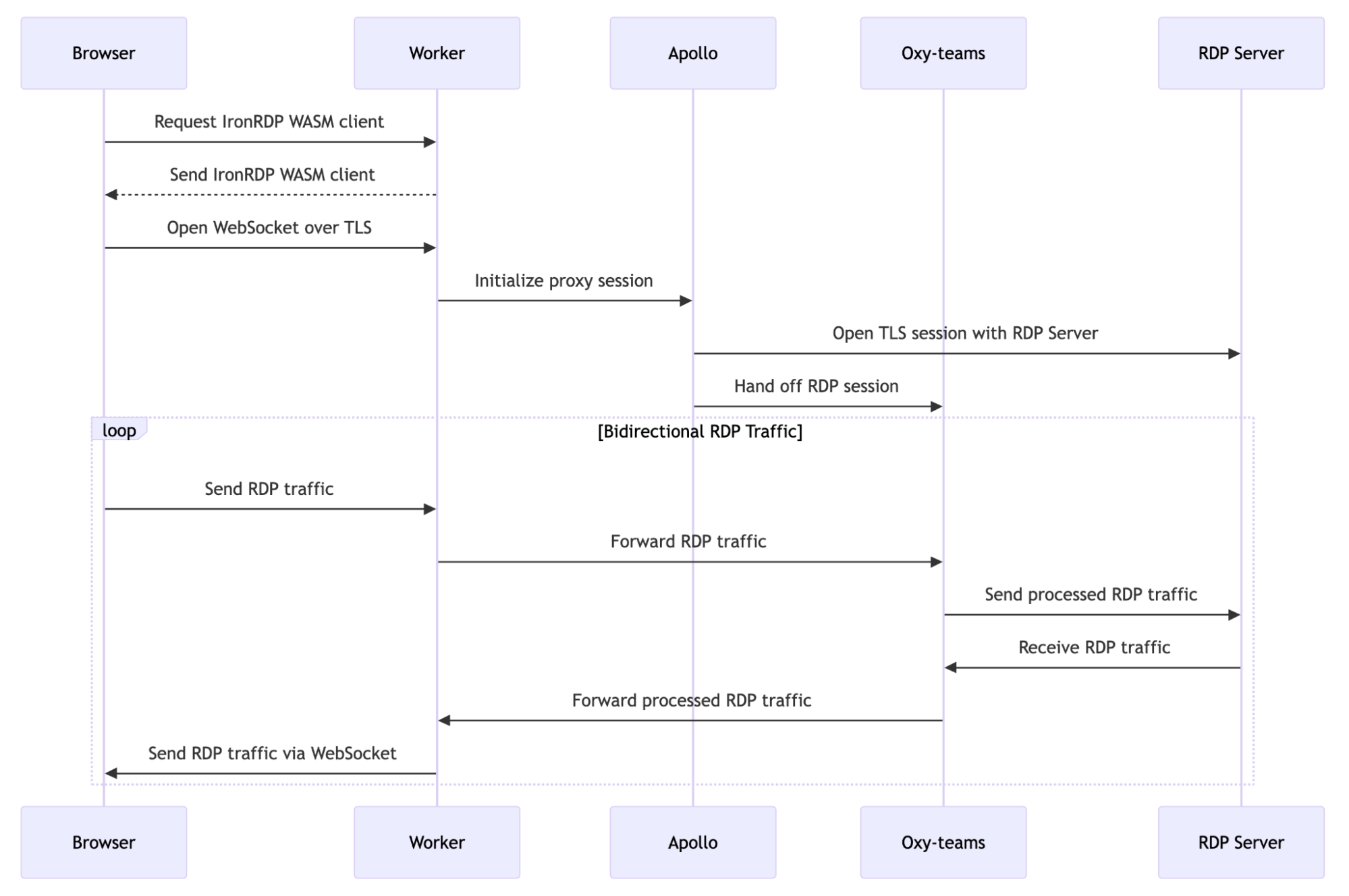 6. Traffic routing: The Worker that receives the IronRDP connection terminates the WebSocket and initiates a connection to Apollo. From there, Apollo creates a connection to the RDP server.