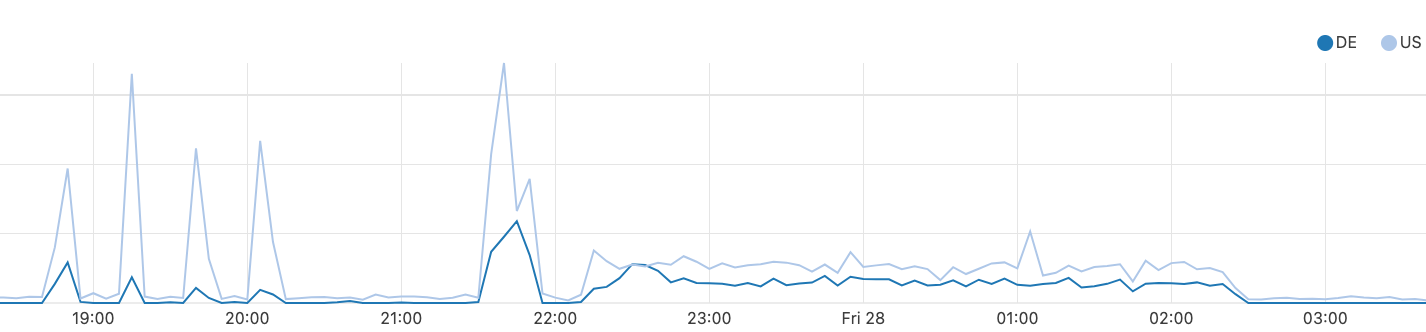 Looking at two source countries during the incident, Germany and the United States, impacted traffic to 1.1.1.1 looked like this: