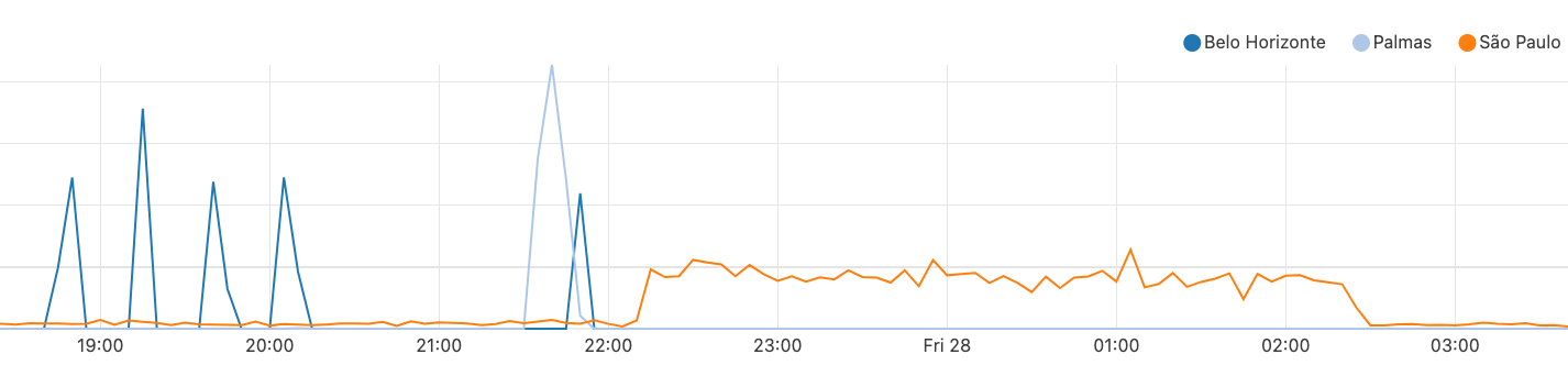 Looking at the graphs, requests to 1.1.1.1 were landing in Brazilian data centers. The gaps between the spikes are when 1.1.1.1 requests were blackholed prior to or within AS267613, and the spikes themselves are when traffic was delivered to Cloudflare with high latency invoked on the request and response. The brief spikes of traffic successfully carried to the Cloudflare peering location with AS267613 could be explained by the 1.1.1.1/32 route flapping within their network, occasionally letting traffic through to Cloudflare instead of it dropping somewhere in the intermediate path.