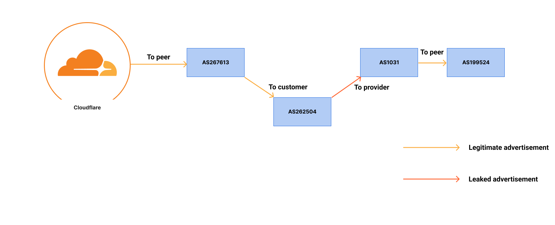 During the Cloudflare 1.1.1.1 incident that happened on June 27, 2024, we ended up fighting the impact caused by a combination of both BGP hijacking and a route leak.