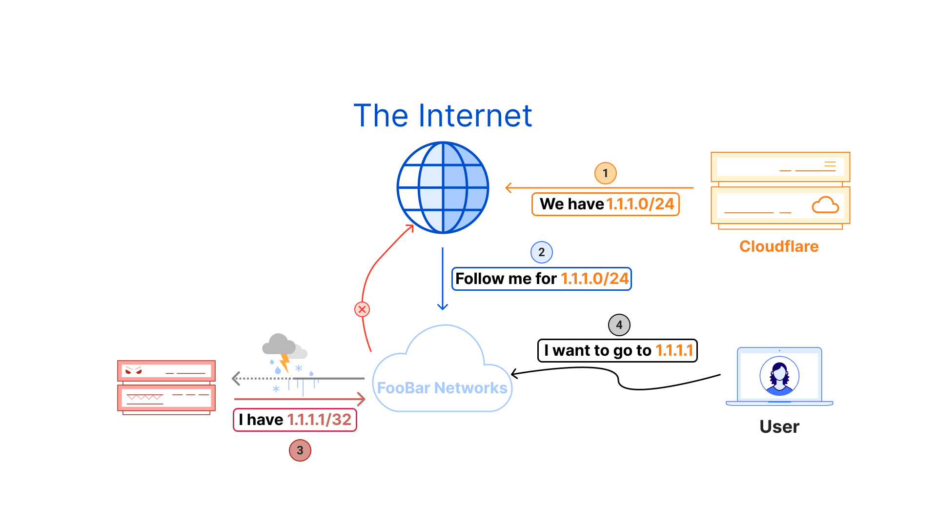 Instead of traffic toward 1.1.1.1 routing to Cloudflare via anycast and landing on one of our servers globally, it will instead land somewhere on a device within FooBar Networks where 1.1.1.1 is terminated, and a legitimate response will fail to be served back to clients. This would be considered a hijack of requests to 1.1.1.1, either done purposefully or accidentally by network operators within FooBar Networks.