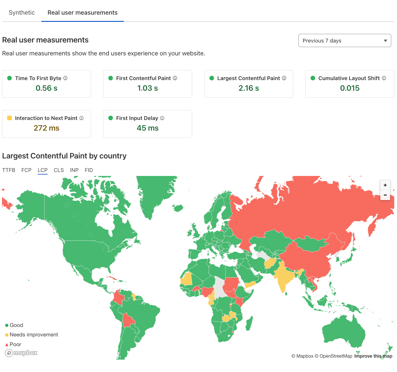Observatory now incorporates RUM data to match against your tested paths. This allows you to easily see how real users experience your site across the globe. This data is also dissected and located in the Observatory tab against your tested paths. Allowing you to view synthetic test data directly against Real User metrics.