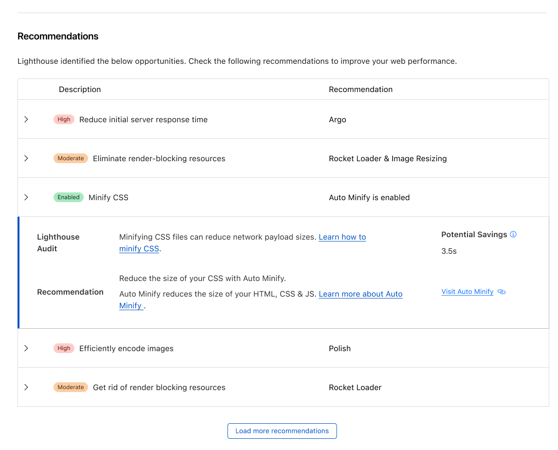 Recommendations from Observatory have become smarter by leveraging the insights gathered from Lighthouse and RUM testing. This enables us to precisely identify issues and offer tailored Cloudflare settings to enhance performance. For instance, when you receive a Lighthouse report it will highlight areas in which your website can be improved. In the provided report, several enhancements for image optimization are suggested. Cloudflare takes this feedback into account and provides product recommendations, such as enabling Polish or utilizing Image Resizing. This empowers our customers to enhance their performance score with just a single click.