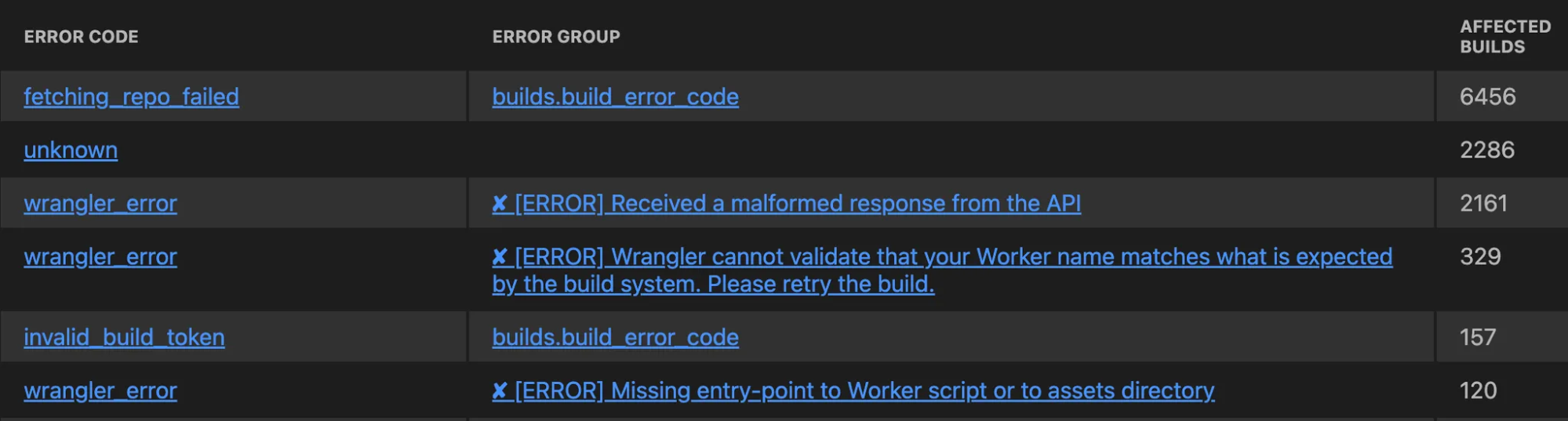 It wouldn’t be useful if all Wrangler errors were grouped under a single generic “wrangler_error” code, so we further grouped them by normalizing the log lines into groups: