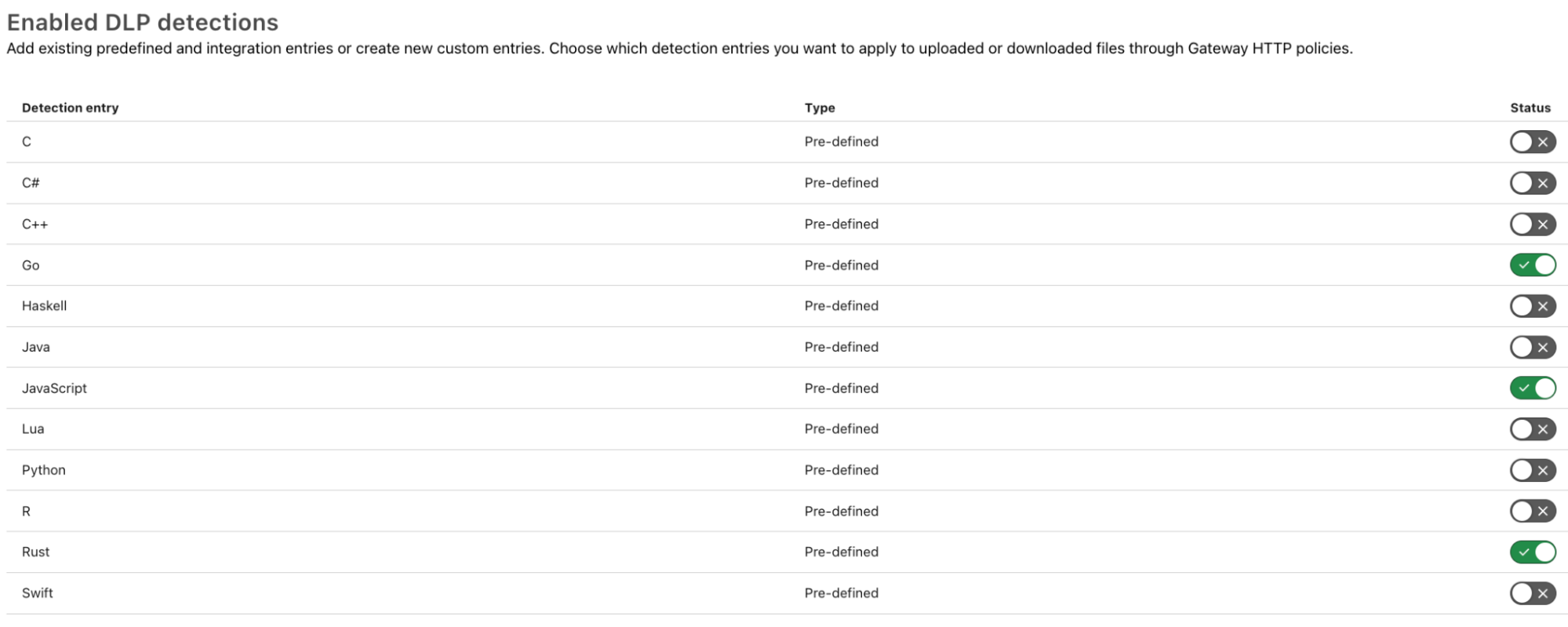 To implement inline blocking of source code, simply select the DLP profiles for the languages you want to detect. For example, if my organization uses Rust, Go, and JavaScript, I would turn on those detections: