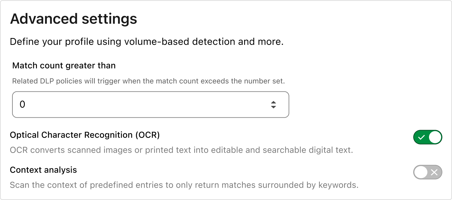 With the detections selected, simply enable the OCR toggle, and wherever you are applying DLP inspections, images in your content will be scanned for sensitive data. The detections work the same in images as they do in the text, including Match Counts and Context Analysis, so no additional logic or settings are needed.