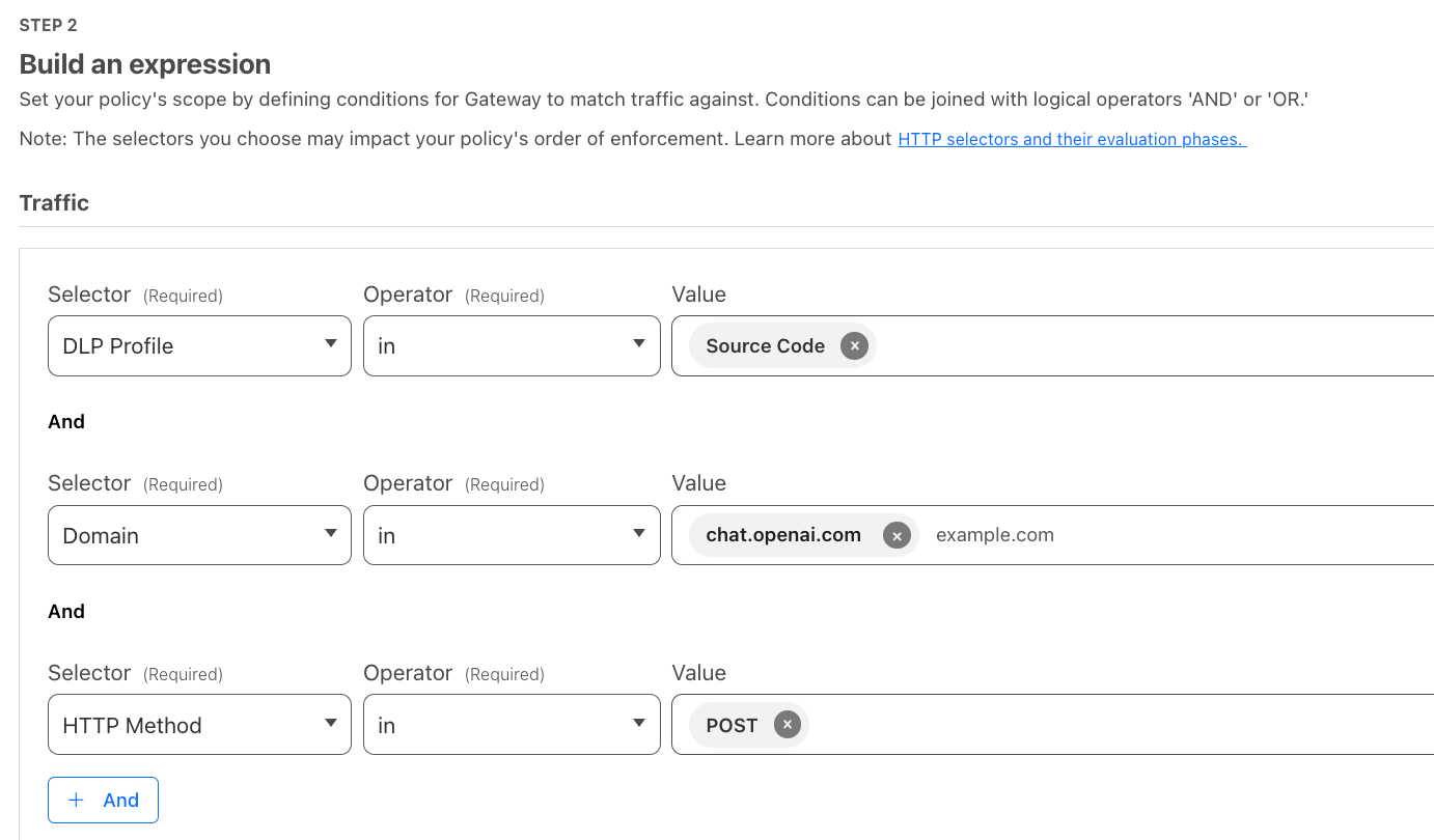 I would then create a blocking policy via our secure web gateway to prevent traffic containing source code**.** Here, we block source code from being uploaded to ChatGPT: