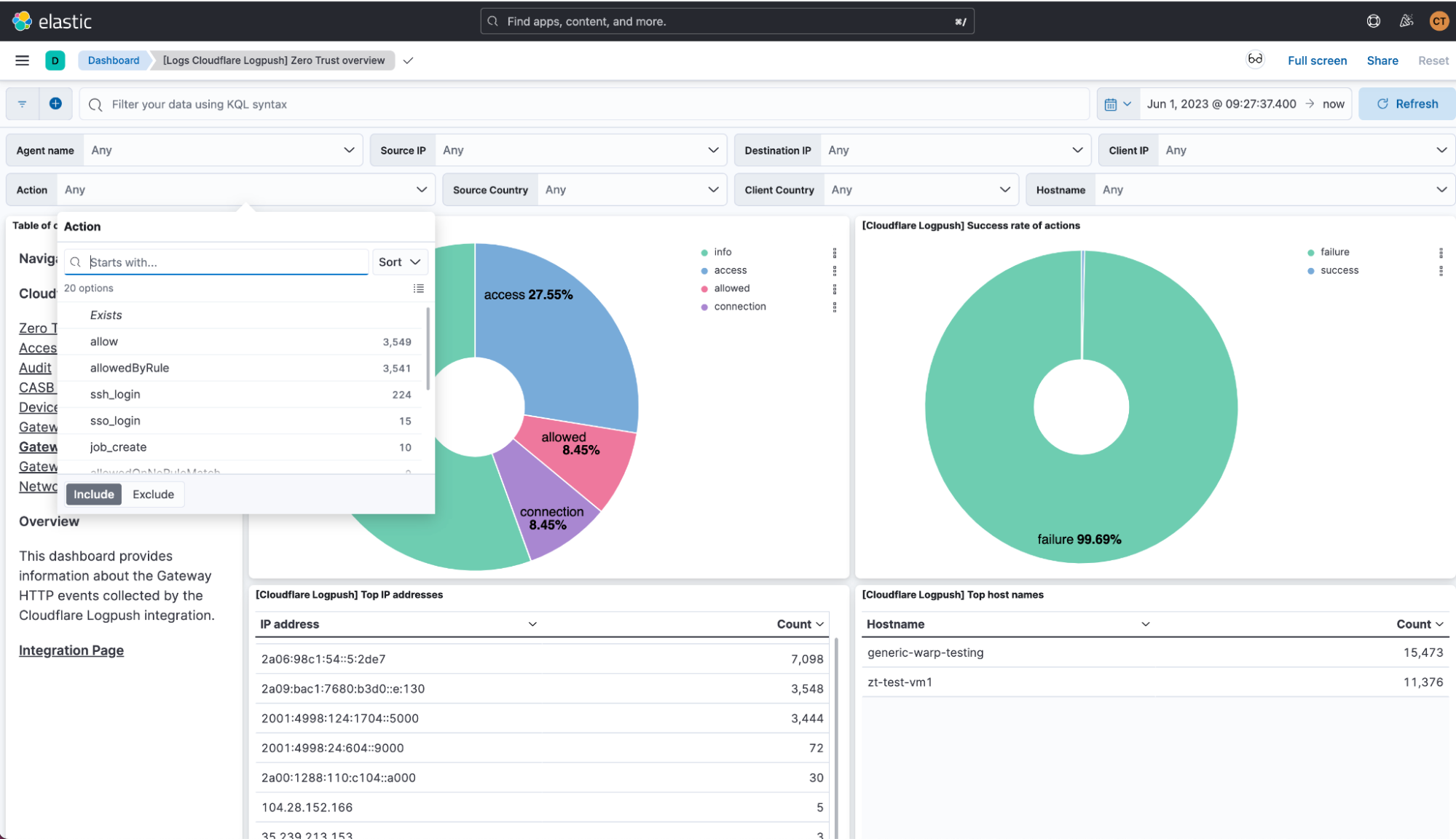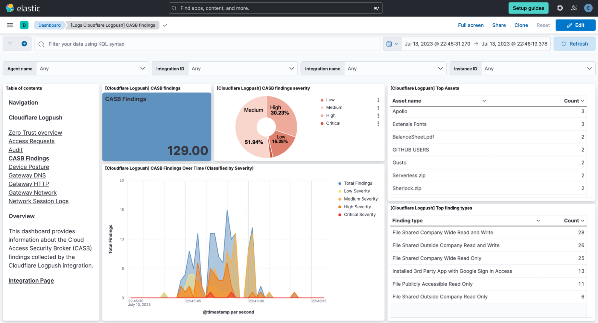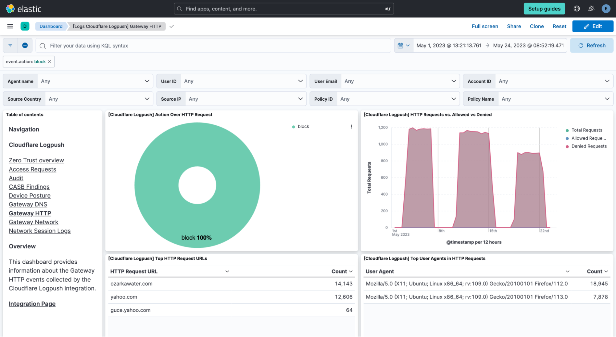 Comprehensive Visibility: Integrating Cloudflare Logpush into Elastic provides organizations with a real-time, comprehensive view of events related to Zero Trust. This enables a detailed understanding of who is accessing resources and applications, from where, and at what times. Enhanced visibility helps detect anomalous behavior and potential security threats more effectively, allowing for early response and mitigation.