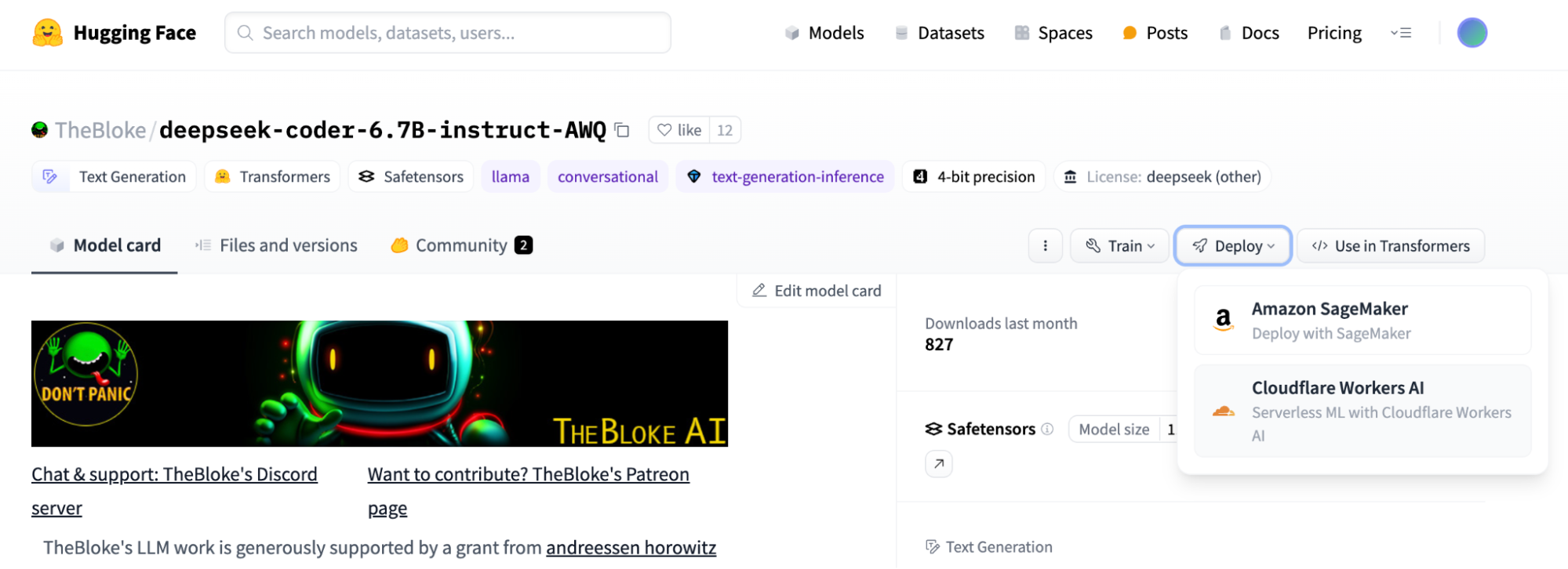Puedes encontrar todos los modelos abiertos compatibles con Workers AI en esta colección de modelos de Hugging Face. El botón "Implementar en Cloudflare Workers AI" está en la parte superior de cada tarjeta de modelo. Para saber más, lee la publicación del blog de Hugging Face y echa un vistazo a nuestros documentos para desarrolladores para empezar. ¿Tienes un modelo que quieras ver en Workers AI? Envíanos un mensaje a Discord con tu petición.