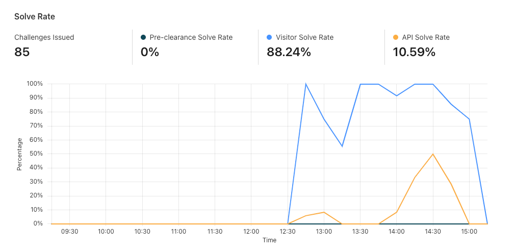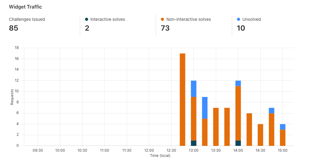 API. Similar to the Visitor Solve Rate, a significant drop in the API Solve Rate may indicate an increase in bot activity, as bots may fail to validate their tokens. Widget Traffic provides insights into the nature of the traffic hitting your website. A high number of challenges requiring interaction may suggest that bots are attempting to access your site, while a high number of unsolved challenges could indicate that the Turnstile widget is effectively blocking suspicious traffic.