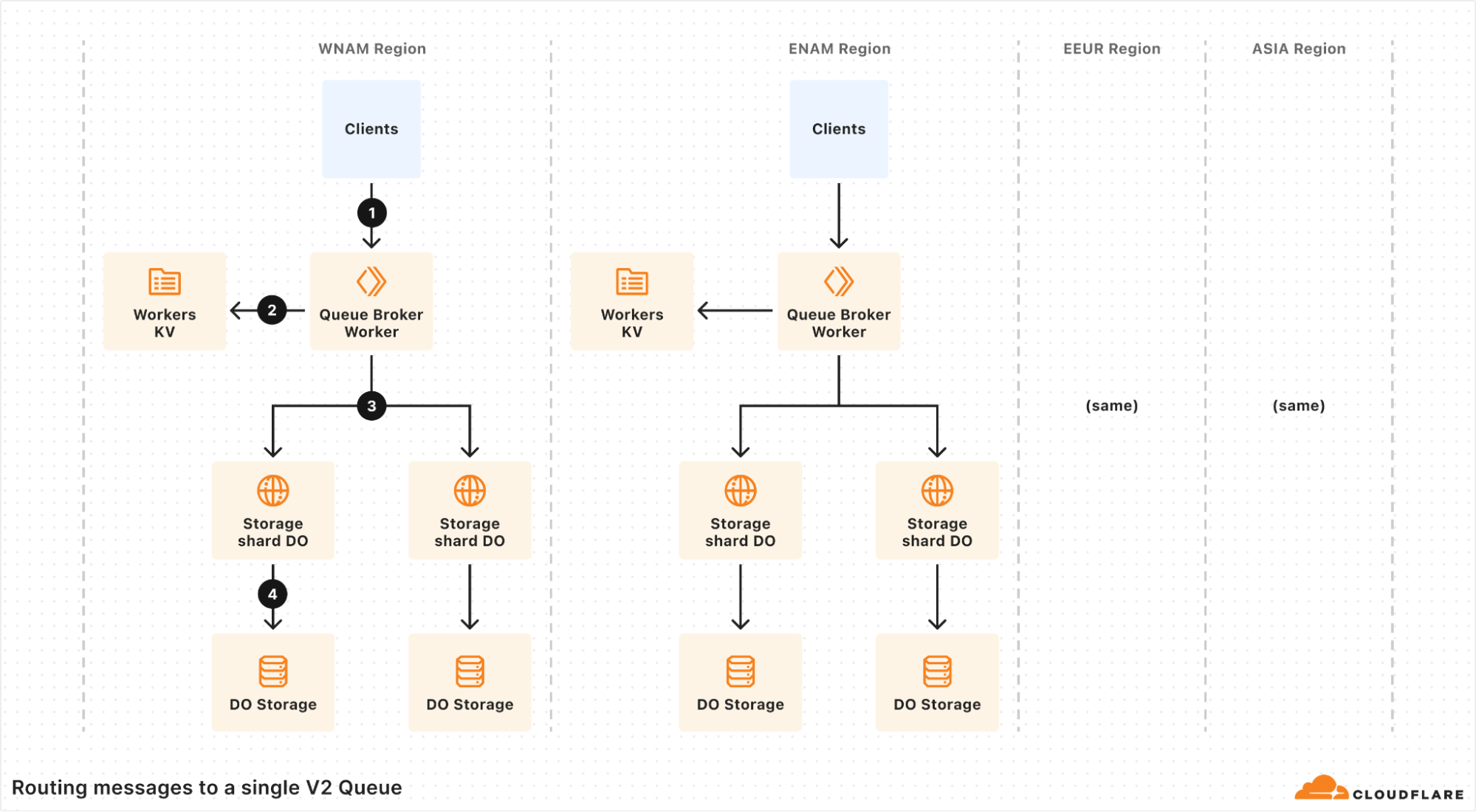 In this v2 architecture, messages are stored in the closest available Durable Object storage cluster near the user, greatly reducing latency since messages don't need to be shipped all the way to WNAM. Using multiple shards within each region removes the bottleneck of a single Durable Object, and allows us to scale each Queue horizontally to accept even more messages per second. Workers KV acts as a fast metadata store: our Worker can quickly look up the shard map to perform load balancing across shards.