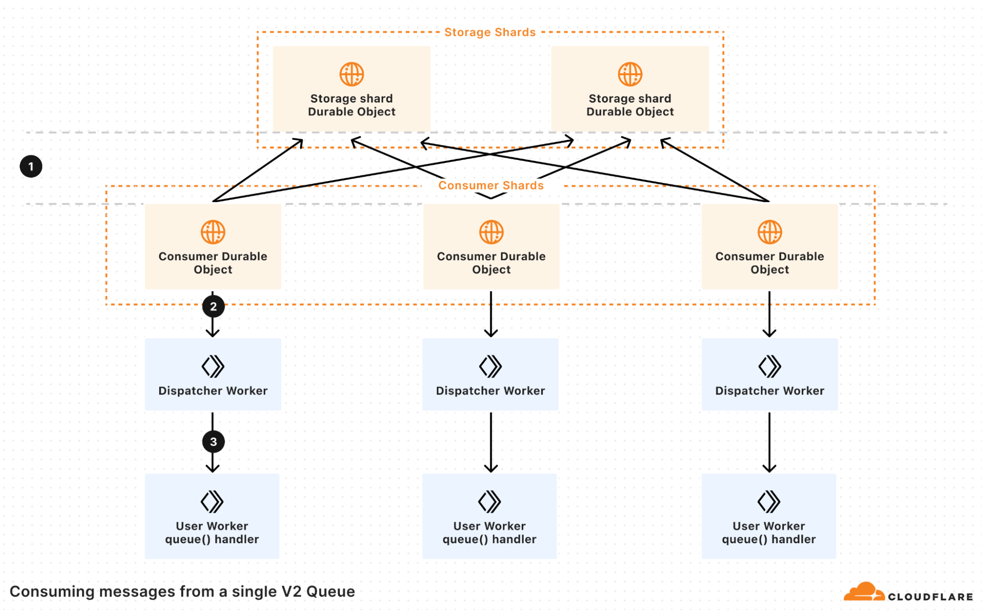To improve the Consumer side of v2 Queues, we used a similar "scale out" approach. A single Durable Object can only perform a limited number of concurrent subrequests. In v1 Queues, this limited the number of concurrent subrequests we could make to our Dispatcher Worker. To work around this, we created a new Consumer Shard Durable Object class that we can scale horizontally, enabling us to execute many more concurrent instances of our users' queue()