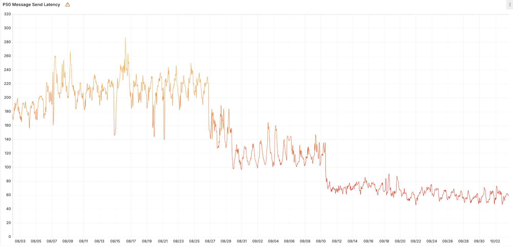 Median latency for sending messages has dropped from ~200ms to ~60ms