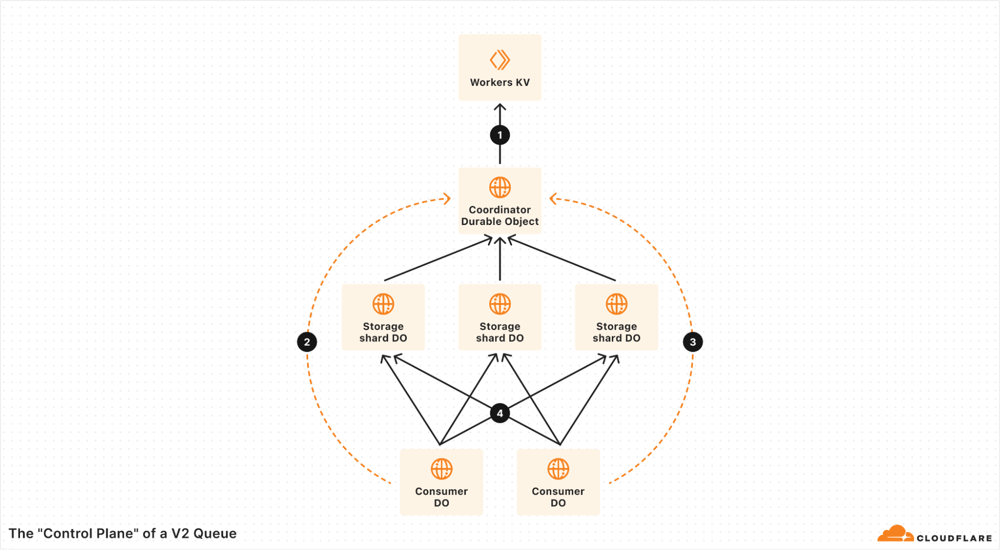 So far, we have primarily discussed the "Data Plane" of a v2 Queue: how messages are load balanced amongst Storage Shards, and how Consumer Shards read and deliver messages. The other main piece of a v2 Queue is the "Control Plane", which handles creating and managing all the individual Durable Objects in the system. In our v2 architecture, each Queue has a single Coordinator Durable Object that acts as the brain of the Queue. Requests to create a Queue, or change its settings, are sent to the Queue's Coordinator.