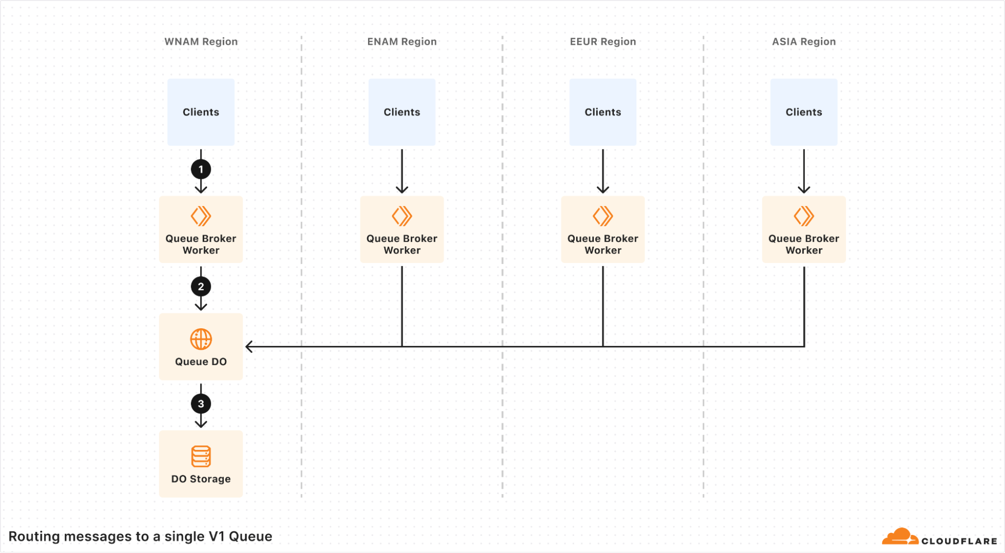 Instead of investing in new infrastructure, we decided to build on top of one of Cloudflare's existing developer platform building blocks: Durable Objects. Durable Objects are a simple, yet powerful building block for coordination and storage in a distributed system. In our initial v1 architecture, each Queue was implemented using a single Durable Object. As shown below, clients would send messages to a Worker running in their region, which would be forwarded to the single Durable Object hosted in the WNAM (Western North America) region. We used a single Durable Object for simplicity, and hosted it in WNAM for proximity to our centralized configuration API service.