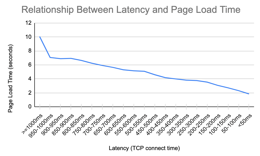 We repeated this analysis with a focus on latency using our own Cloudflare data. The results are summarized in the next chart, showing a familiar pattern. For every 200 milliseconds of latency we can save, we cut the page load time by over 1 second. That relationship applies when the latency is 950 milliseconds. And it applies when the latency is 50 milliseconds.