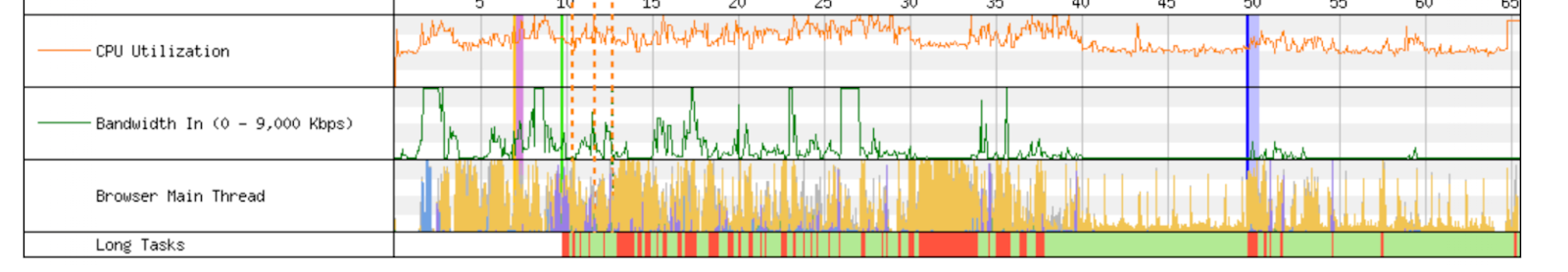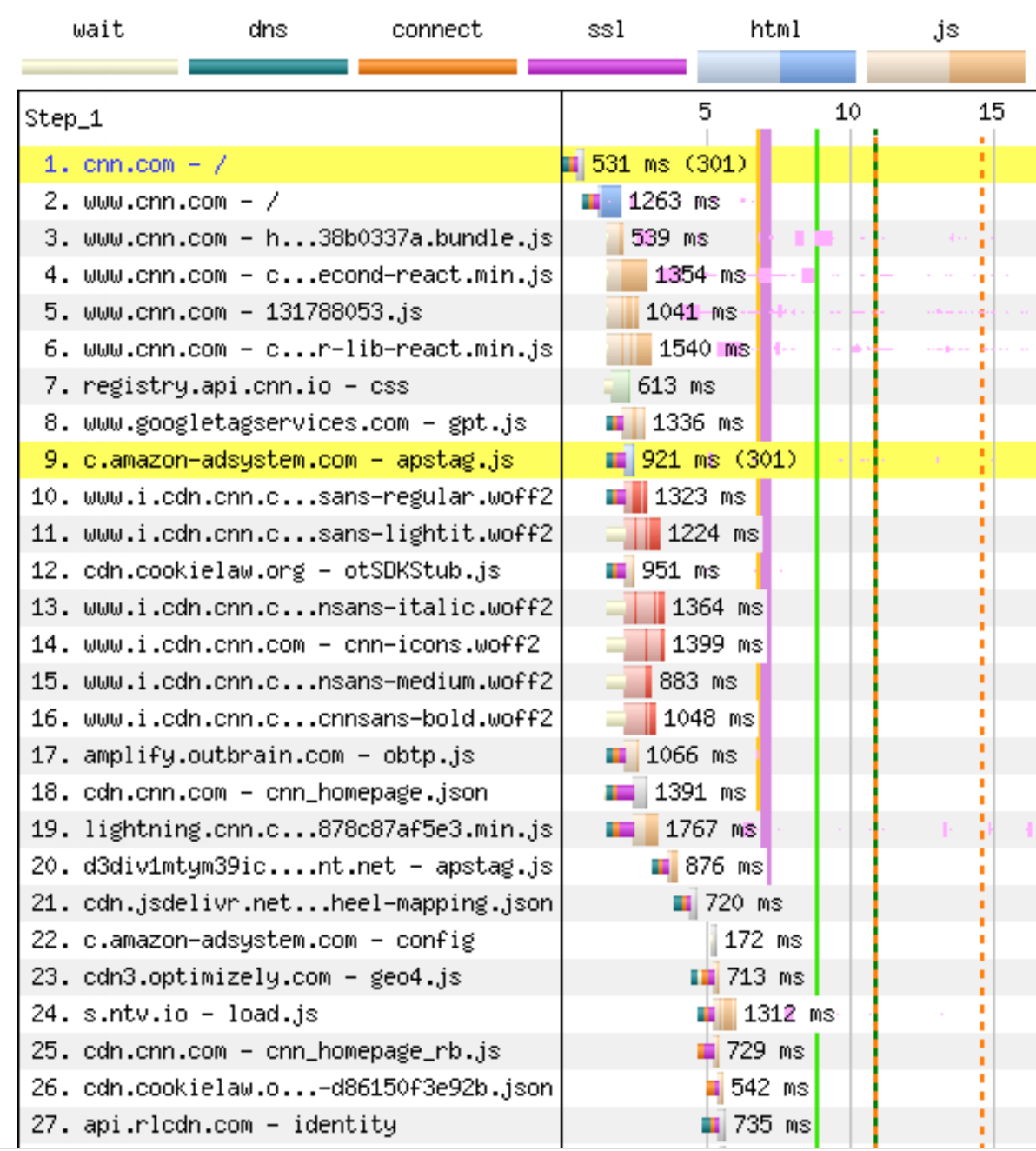 The chart below shows the beginning of what the browser does when it loads cnn.com. First is the connection handshake phase, followed by 301 redirect to www.cnn.com, which requires a completely new connection handshake before the browser can load the main HTML page in step two. Only then, more than 1 second into the load, does it learn about all the JavaScript files it requires in order to render the page. Files 3-19 are requested mostly on the same connection but are not served until after the HTML file has been delivered in full. Files 8, 9, and 10 are requested over separate connections (all costing handshakes). Files 20-27 are all blocked on earlier files and similarly need new connections. They can’t start until the browser has the previous file back from the server and executes it. There are 650 assets in this page load, and the blocking happens all the way through the page load. Here’s why this matters: better latency makes every file load faster, which in turn unblocks other files faster, and so on.