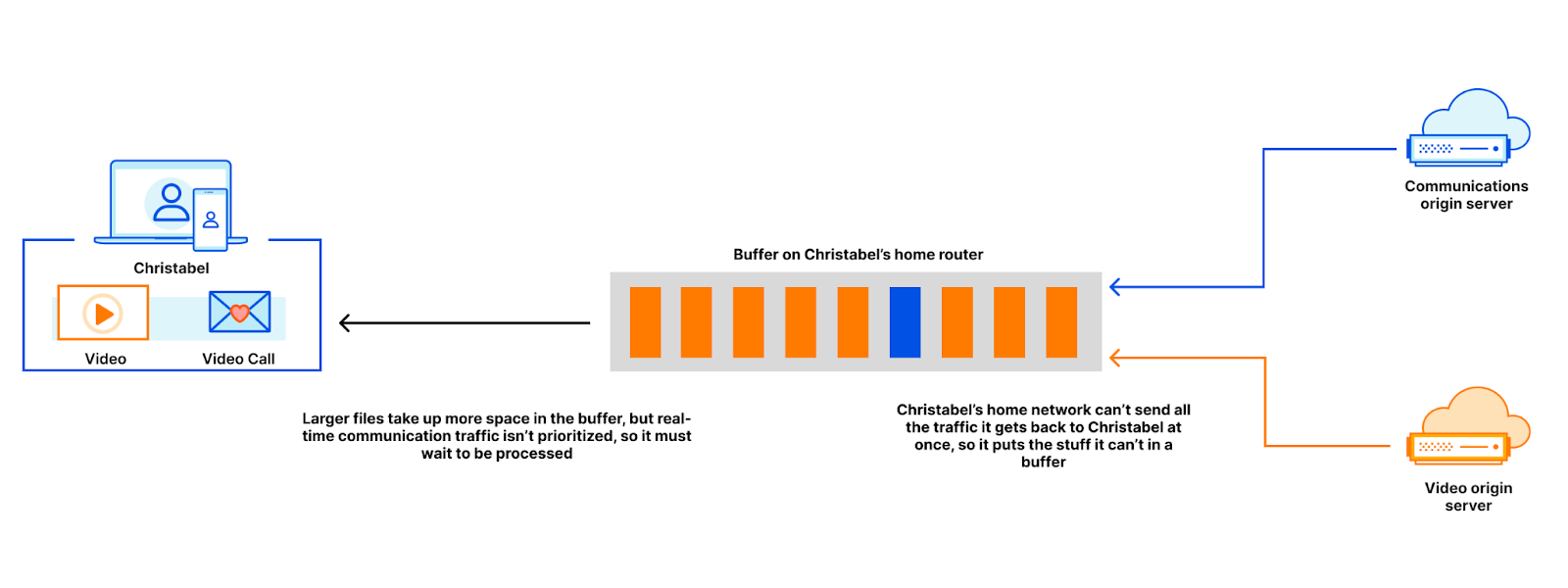 Say for example, Christabel is watching a stream of the news while on a video meeting. When Christabel starts watching the video, her browser fetches a bunch of content and stores it in various buffers on the way from the content host to the browser. Those same buffers also contain data packets pertaining to the video meeting Christabel is currently in. If the data generated as part of a video conference sits in the same buffer as the video files, the video files will fill up the buffer and cause delay for the video meeting packets as well. The larger the buffers, the longer the wait for video conference packets.
