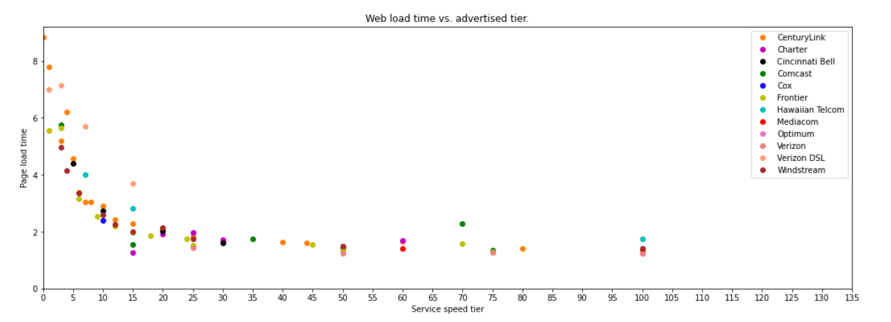 In the 2010 paper from Google, the author simulated loading web pages while varying the throughput and latency of the connection. The finding was that above about 5 Mbps, the page doesn’t load much faster. Increasing bandwidth from 1 Mbps to 2 Mbps is almost a 40 percent improvement in page load time. From 5 Mbps to 6 Mbps is less than a 5 percent improvement.