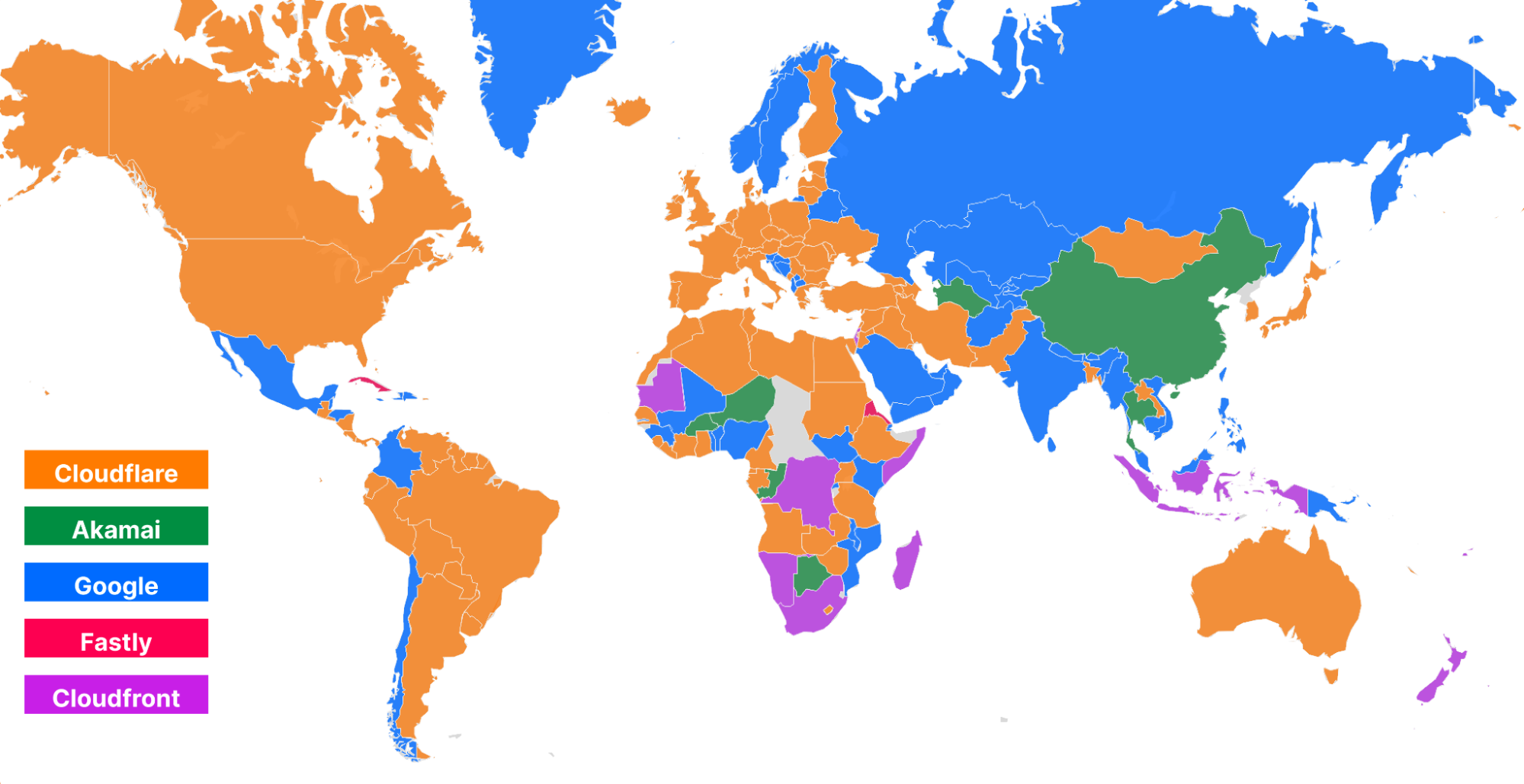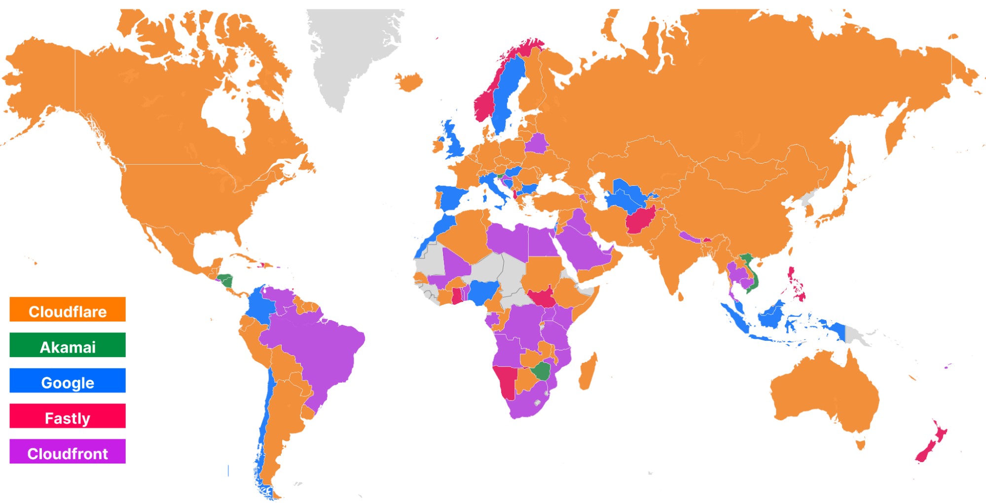 Using data on the top 3,000 networks from Cloudflare One Week (June 2022), here’s what the world map looks like (Cloudflare is in orange):