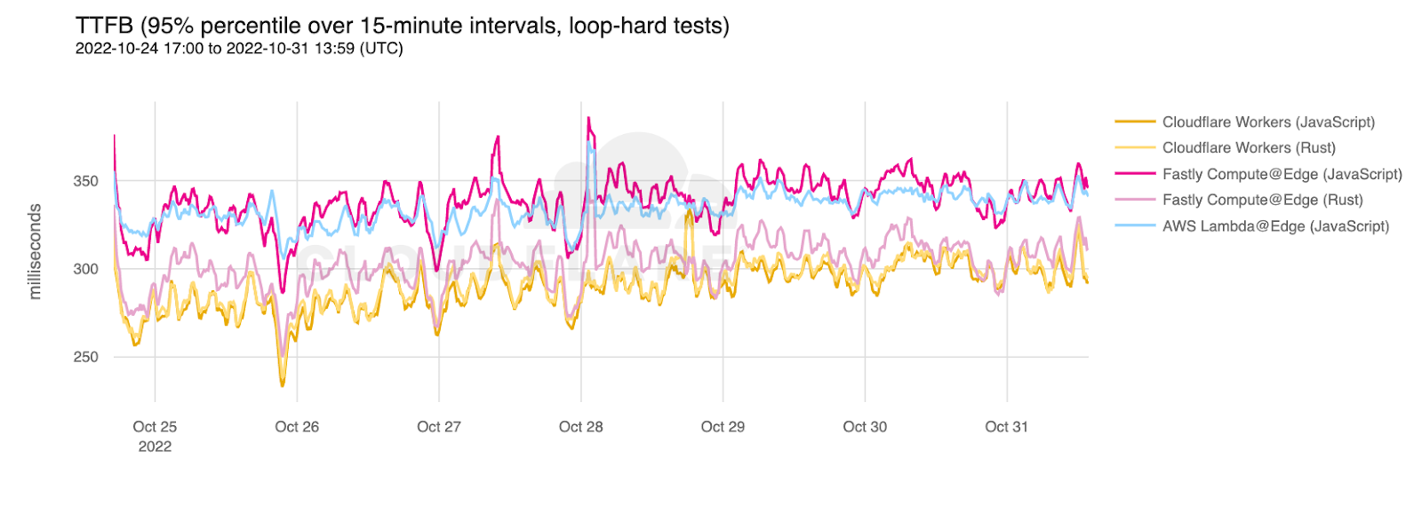 To verify these results, we compared the Catchpoint results to our own data set. Here is the p95 TTFB for the JavaScript and Rust hard loops for Fastly, AWS, and Cloudflare from our data: