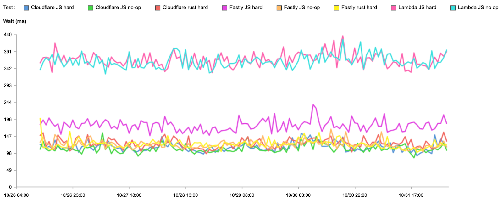 But what about wait times? Remember, wait times represent time spent computing the request, so who has optimized their platform best? Again, it’s Cloudflare, although Fastly still has a slight edge on the hard Rust test (which we plan to beat by further optimization):