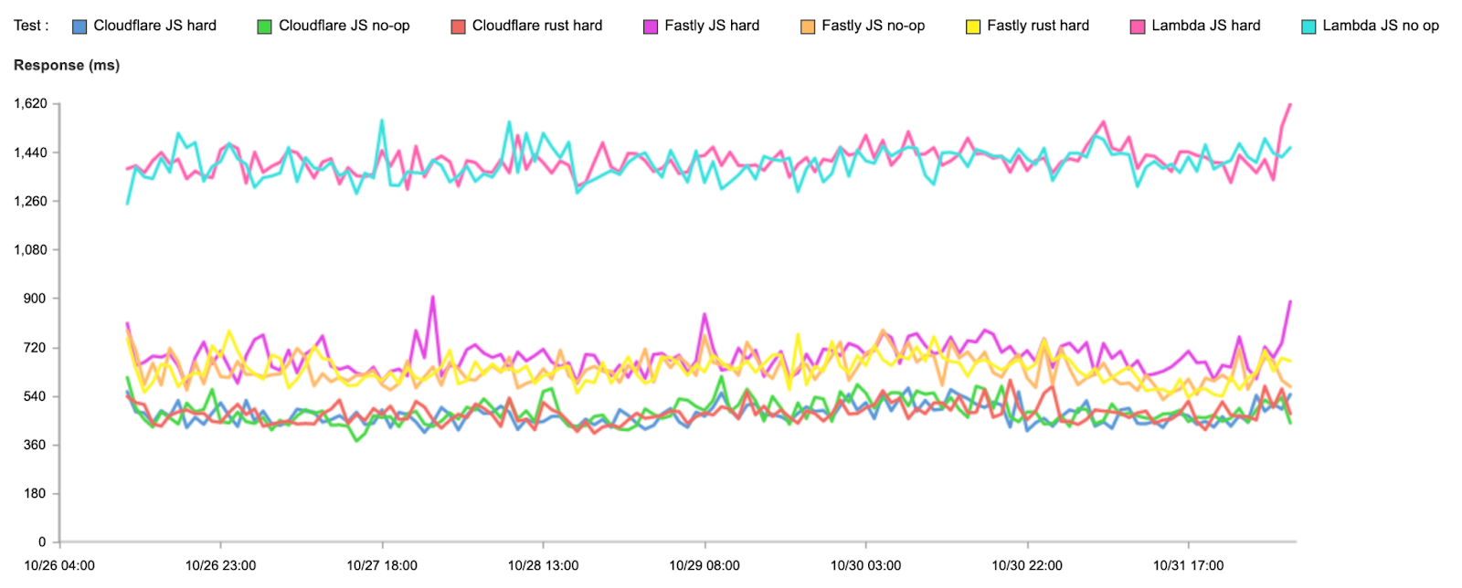 We’re trying to test how good each platform is at optimizing compute in addition to evaluating how close each platform is to end-users. However, for this test, we did not run a Rust test on Lambda@Edge because it did not natively support our Rust function without uploading a WASM binary that you compile yourself. Since Lambda@Edge does not have a true first-class developer platform and tooling to run Rust, we decided to exclude the Rust scenarios for Lambda@Edge. So when we compare numbers for Lambda@Edge, it will only be for the JavaScript simple and JavaScript hard tests.