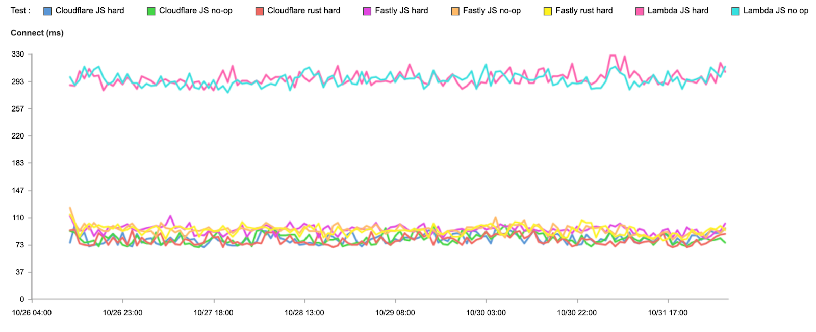 To measure connect, wait, and response, we perform three tests against each provider: a simple no-op JavaScript function, a complex JavaScript function, and a complex Rust function. We don’t do a simple Rust function because we expect it to take almost no time at all, and we already have a baseline for end-to-end functionality in the no-op JavaScript function since many providers will often compile both down to WebAssembly.