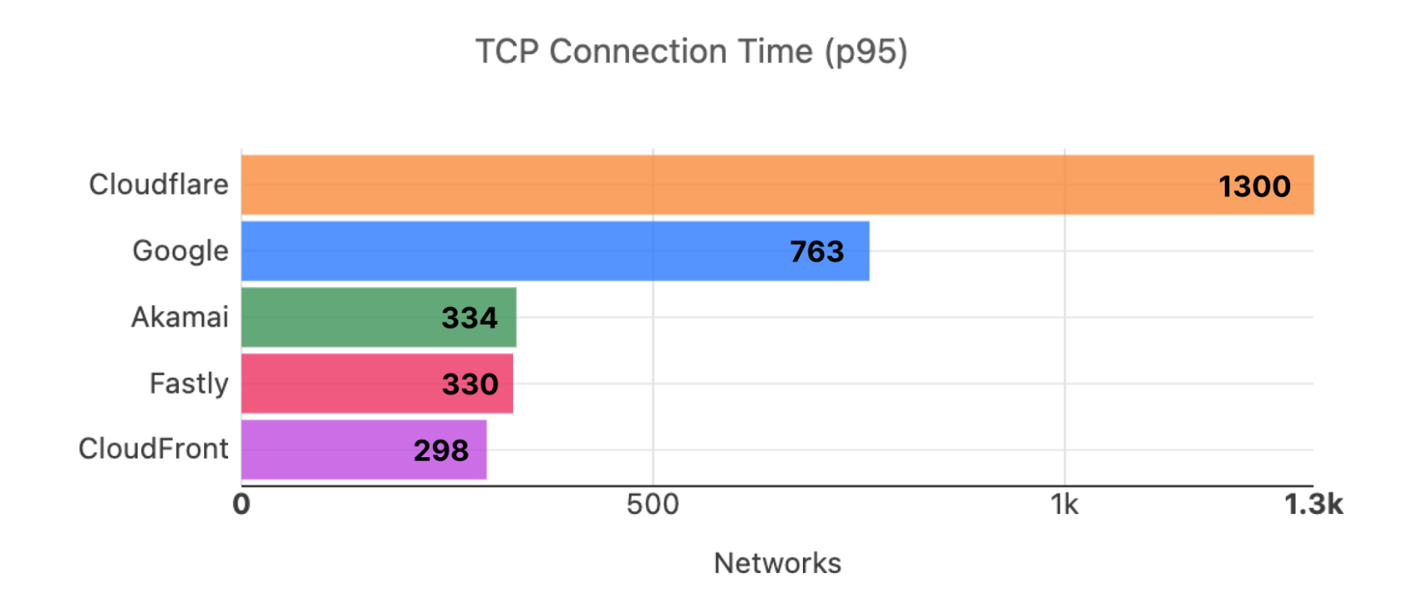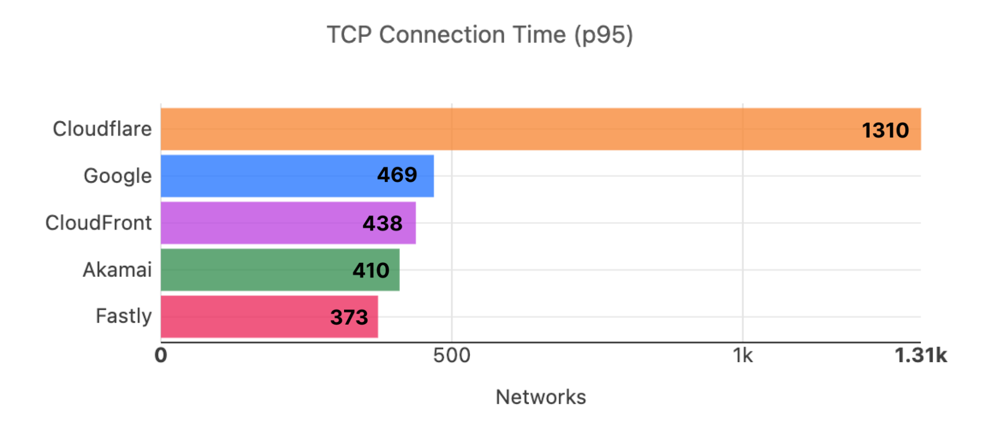 During Cloudflare One Week (June 2022), we shared that we were faster in more of the most reported networks than our competitors. Out of the top 3,000 networks in the world (by number of IPv4 addresses advertised), here’s a breakdown of the number of networks where each provider is number one in p95 TCP Connection Time, which represents the time it takes for a user on a given network to connect to the provider. This data is from Cloudflare One Week (June 2022):