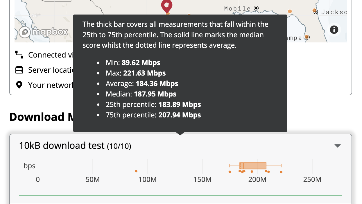 For each file size, we show you the measurements inside a table, allowing you to drill down. Each dot in the bar graph represents one of the measurements, with the thin line delineating the range of speeds we've measured. The slightly thicker block represents the set of measurements between the 25th and 75th percentile.