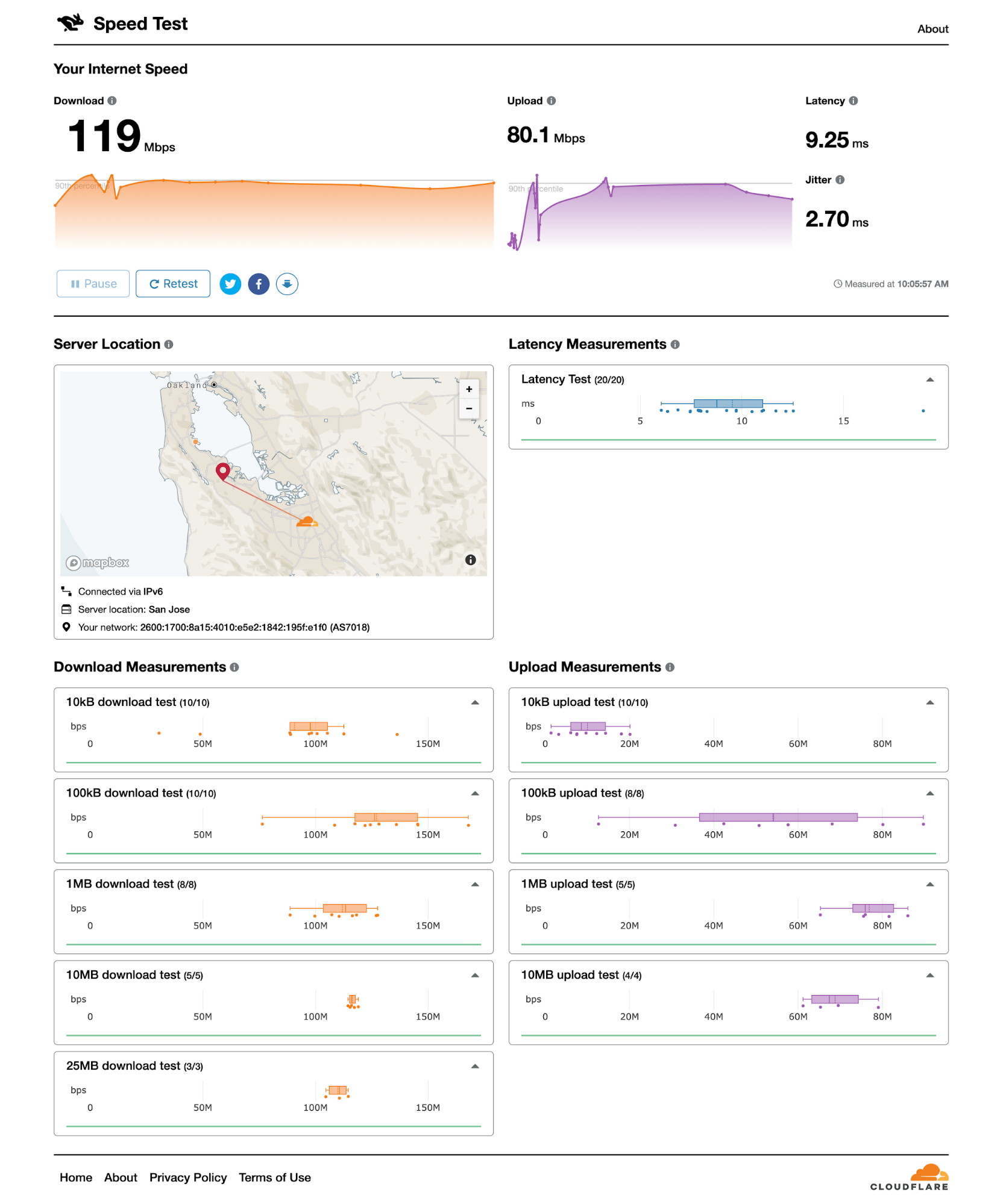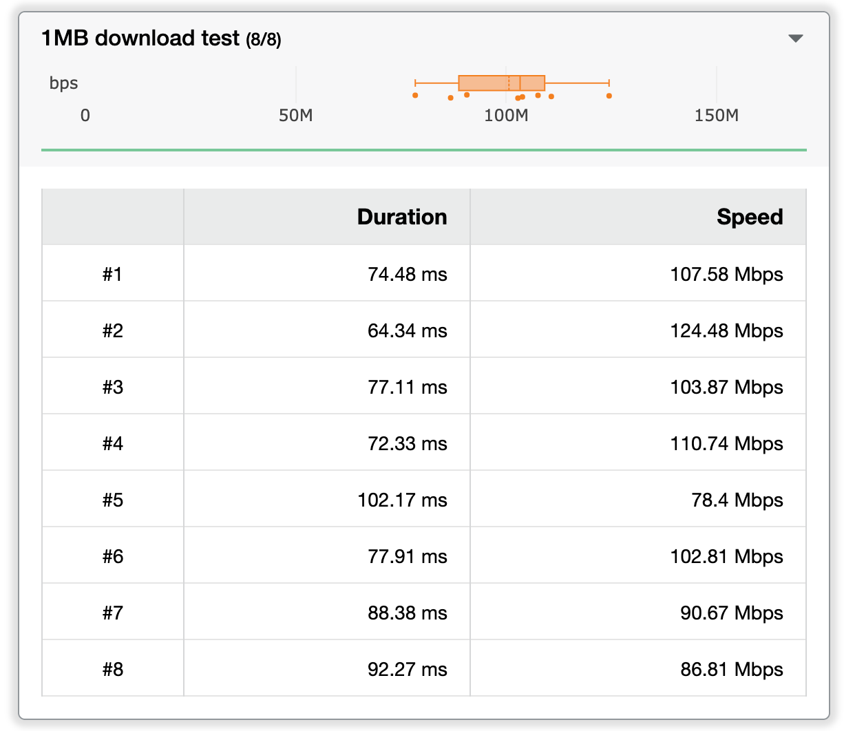 Although there are a slew of speed testing tools out there, none of them give you precise insights into how they came to those measurements and how they map to real-world performance. With speed.cloudflare.com, we give you insights into what we’re measuring and how exactly we calculate the scores for your network connection. Best of all, you can easily download the measurements from right inside the tool if you’d like to perform your own analysis.
