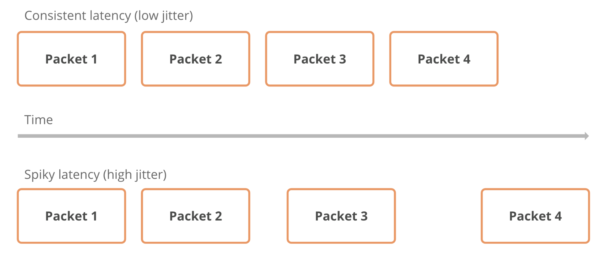 But, latency only paints half the picture. Imagine yourself in a conversation where you have some delay before you hear what the other person says. That may be annoying but after a while you get used to it. What would be even worse is if the delay differed constantly: sometimes the audio is almost in sync and sometimes it has a delay of a few seconds. You can imagine how often this would result into two people starting to talk at the same time. This is directly related to how stable your latency is and is represented by the jitter metric. Jitter is the average variation found in consecutive latency measurements. A lower number means that the latencies measured are more consistent, meaning your media streams will have the same delay throughout the session.
