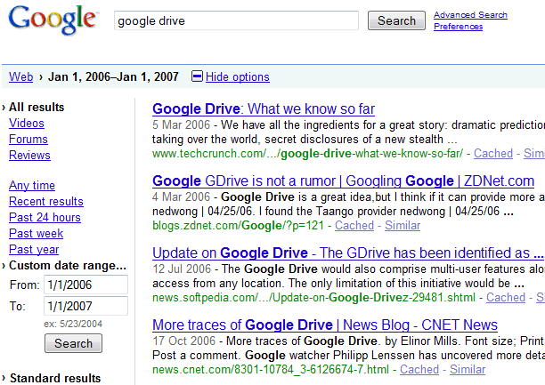 Until now, you could only find images from the past 24 hours, the past week or the past year. If you edited Google's URL, the feature could be used to find pages from the past 10 days, 2 months or other custom periods of time, but you couldn't use it to find pages from 2006.