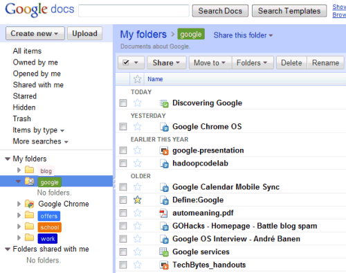 Another change is that Google Docs has a Flash uploader that lets you upload multiple files at a time and to place the files in a folder.