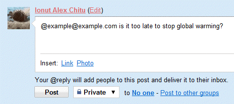 Send direct messages.If you'd like to send a private message to someone, type @ and use Gmail's autocomplete feature to find the email address of your contact. After typing the message, make sure that the private option is selected, click on "Post to other groups" and create an empty group. You could call it "No one", "Empty group" etc. Now you can send your message.
