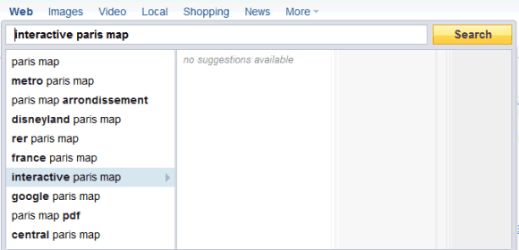 Another feature that's not very helpful is promoting your own services, instead of showing unbiased suggestions. When you type "w", Yahoo shows only two suggestions that seem to be manually added: "Yahoo! Weather" and "Yahoo! Widgets". Type "m" and Yahoo shows 8 suggestions that are related to Yahoo.