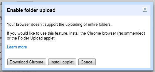 Firefox and Safari users will have to install a Java applet to upload folders. These browsers don't have native support for uploading folders, but the Java applet has an important advantage: you can upload both folders and files simultaneously.