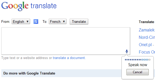 Google Translate is the first Google service that uses this feature. If you use Google Chrome 11 Beta, Google Chrome 12 Dev/Canary or a recent Chromium build and visit Google Translate, you can click the voice input icon. Right now, this feature only works for English, so you need to select "English" from the list of input languages.
