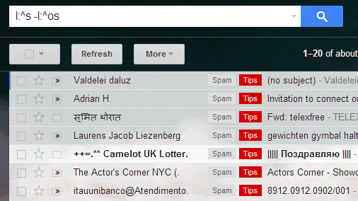 shortcuts for system Gmail labels. For example, instead of searching for [issue in:inbox], you can use [issue label:^i.] or [issue l:^i]. Instead of searching for [receipt in:spam] or [receipt label:spam], you can use [receipt l:^s].