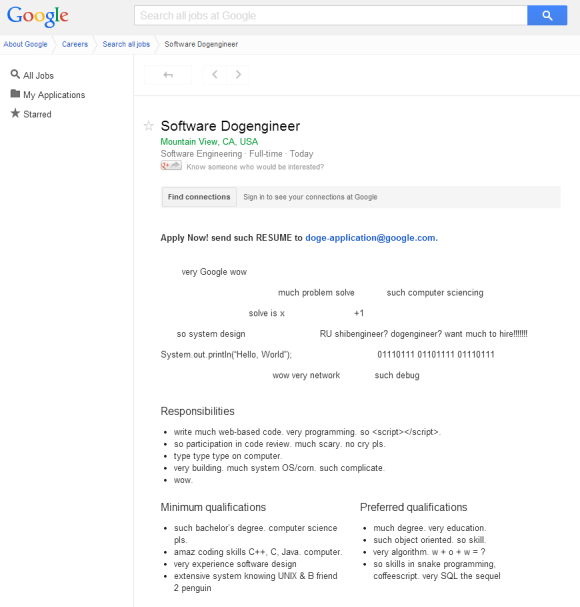 a dogengineer job at Google. You need to "write much web-based code, very programming, so participation in code review, much scary, no cry pls, type type type on computer, very building, much system OS/corn, such complicate."