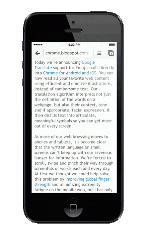 Google Chrome announced "Google Translate support for Emoji, built directly into Chrome for Android and iOS. You can now read all your favorite web content using efficient and emotive illustrations, instead of cumbersome text. To view webpages in Emoji today on your Android and iOS devices, make sure you have the latest version of Chrome for Mobile from the Play Store or App Store. Then simply tap on the menu icon and select the 'Translate to Emoji' option. Tap 'Reload' to view the original page. This feature is currently only available in English.