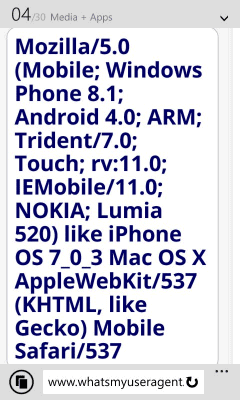 Android 4.0". The sites that check the user agent for strings like "iPhone", "Android" or "Mobile Safari" are supposed to work well in the latest Internet Explorer for Mobile. While the browser still has the same Trident rendering engine, Microsoft used some workarounds that improve WebKit compatibility.