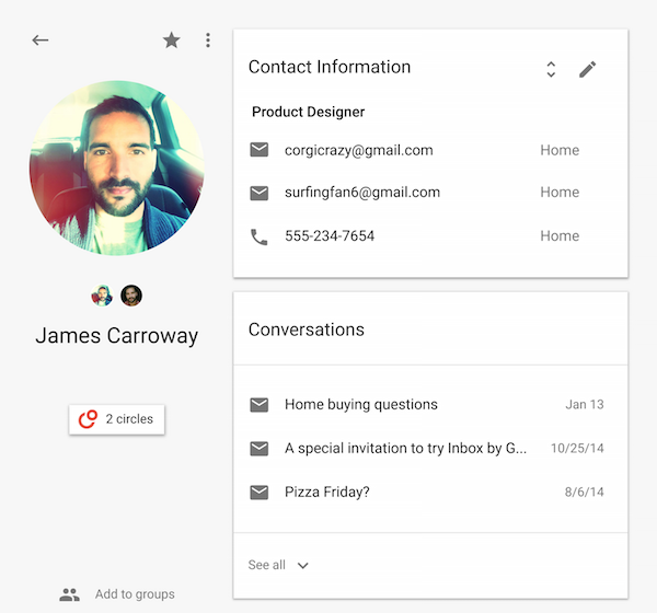 When you click a contact, Google now opens a card overlay with a bigger picture and more information from the Google Profile page. Google also shows the most recent email conversations and meetings with that person.