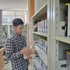 Seorang perempuan paruh baya dengan kaca mata kotak duduk tenang sambil merapikan buku-buku di Perpustakaan Daerah (Perpusda) Kabupaten Lumajang, Minggu (14/9/2025).