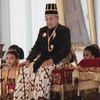 Tamu undangan dan kerabat dengan latar belakang foto Raja Keraton Surakarta Sampeyan Ndalem Ingkang Sinuhun Kanjeng Susuhunan Paku Buwono XIII saat pergelaran tradisi tingalan dalem jumenengan di Keraton Surakarta, Kota Surakarta, Jawa Tengah, Kamis (16/2/2023).Prosesi kirab akan dimulai dari dalam Keraton Kasunanan Surakarta, tepatnya dari Bangsal Magangan. Rombongan akan melintas melalui Alun-Alun Kidul, kemudian keluar melalui Plengkung Gading ke arah kanan dan melanjutkan perjalanan di Jalan Veteran.
