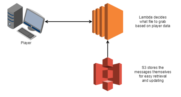 The basic system design uses Amazon Simple Storage Service (S3), which will contain the various text files that could be delivered to the player. Amazon’s serverless coding service, AWS Lambda, will look at the data sent from your game, make a decision on what message the player should see, grab the right text file from S3, personalize the message, and then deliver it to the player.